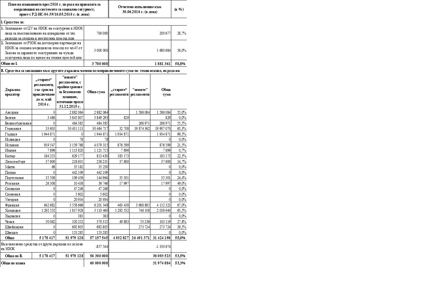 Общият размер на разходите реда на правилата за координация на системите за социална сигурност на ЕС към 30.06.2016 г. е 31 975 хил. лв. или 53,3% от заложените в Плана.