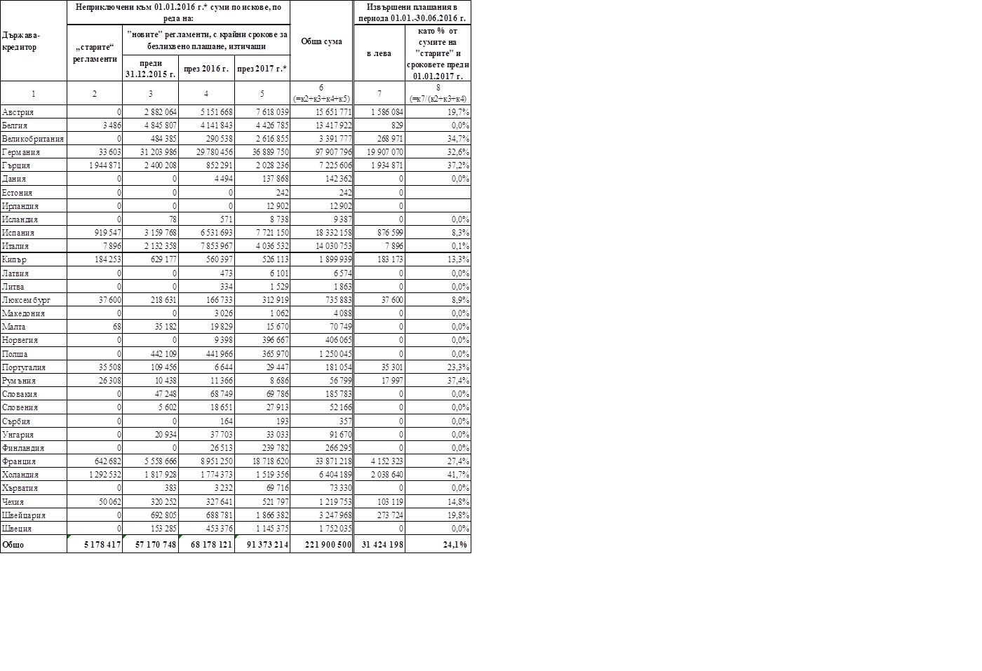 В колона 7 е представен процентът, който извършените плащания в периода 01.01.- 30.06.2016 г. представляват от неприключените суми на исковете на другите държави, дължими до 31.12.2016 г. (исковете по реда на "старите" регламенти исковете по реда на новите „регламенти“, постъпили до 30.06.2015 г. с крайни срокове за безлихвено плащане, изтичащи до 31.12.2016 г.) Общо плащанията през І-во полугодие на 2016 г. в размер на 31 424 хил. лв. представляват 24,1% от стойността на задълженията към другите държави, дължими през 2016 г. в общ размер от 130 537 хил. лв.