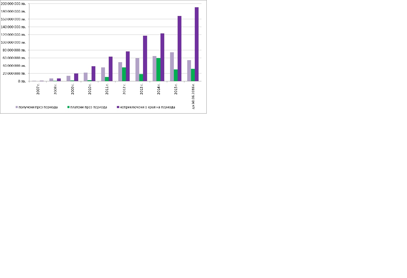 През всяка от годините от приемането на България в ЕС годишните суми на платените задължения по исковете на другите държави са по-ниски от стойността на постъпилите през годината искове, което води до непрестанно нарастване на стойността на задълженията към другите държави, като към 30.06.2016 г. те са на стойност 190 476 хил. лв..